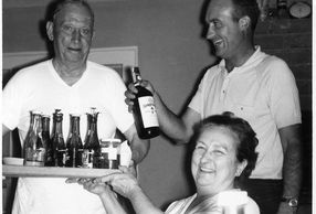 Josephine (left) and Anthony (2nd from left) enjoying drinks and conversation at the bar in Zorka and Tom's home. Anthony's sister Winifred and her husband John join in.